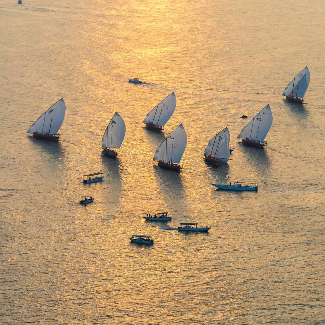 The largest of the dhows is the 60ft class. Keeping in tradition the boats closely resemble the dhows used for pearl diving and fishing in the olden days. Again due to safety reasons, the rigging is made of modern materials, and the 60ft class dhows are rigged with two masts and sails. This makes the boats more technical and requires more skill from the skipper the master the dhow in the waves and the wind. The Championship for the penultimate class of dhows is competed over 3 races. Throughout the year the Abu Dhabi Sailing & Yacht Club organizes long distance races for these dhows. The class will have up to 80 boats on the start line. The dhows lay on anchor at the start, the crew ready to race. Once the signal is given, it is truly a magnificent sight to the fleet raise their sails and race the 15 Nautical Miles back to Abu Dhabi.